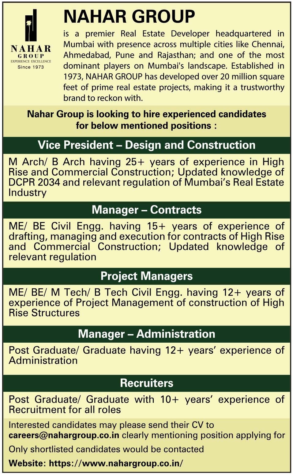 The Nahar Group is guided by a penchant for perfection, attention to detail, and an abiding respect for nature. Under the aegis of Chairman & Managing Director, Mr. Sukhraj Nahar and Vice-Chairperson Ms. Manju Yagnik, the group has spent the last four decades partnering with globally acclaimed companies and working closely with customers, resulting in the creation of inspirational landmarks across 15 million sq. ft. of residential, commercial and industrial properties in Mumbai, Pune, Ahmedabad, and parts of Rajasthan.