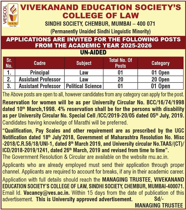 Vivekanand Education Society (VES) was established at the hands of our Founder Trustee Visionary Late. Shri Hashuji Advani. He believed in imparting education as selfless service to society. Following his footsteps, Vivekanand Education Society has always strived to impart education with morals and ethics at all levels.