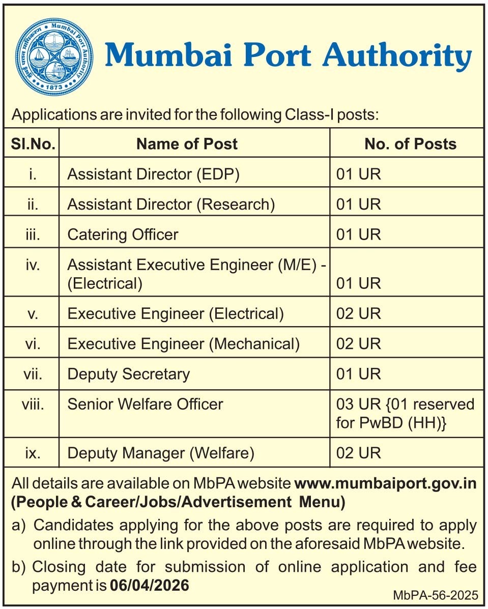 All details are available on MbPA website www.mumbaiport.gov.in (People & Career/Jobs/Advertisement Menu) a) Candidates applying for the above posts are required to apply online through the link provided on the aforesaid MbPA website. b) Closing date for submission of online application and fee payment is 06/04/2026