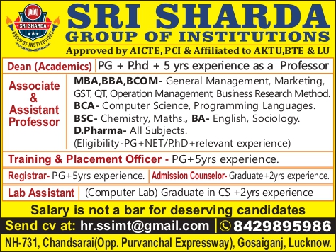 Sri Sharda Group of Institutions is inviting applications for the role of Associate & Assistant Professor.