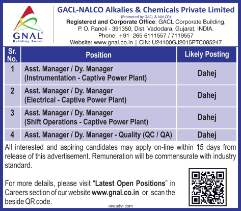 GACL-NALCO Alkalies & Chemicals Private Limited is inviting applications for the role of Asst. Manager / Dy. Manager (Instrumentation - Captive Power Plant). Likely Posting: Dahej.