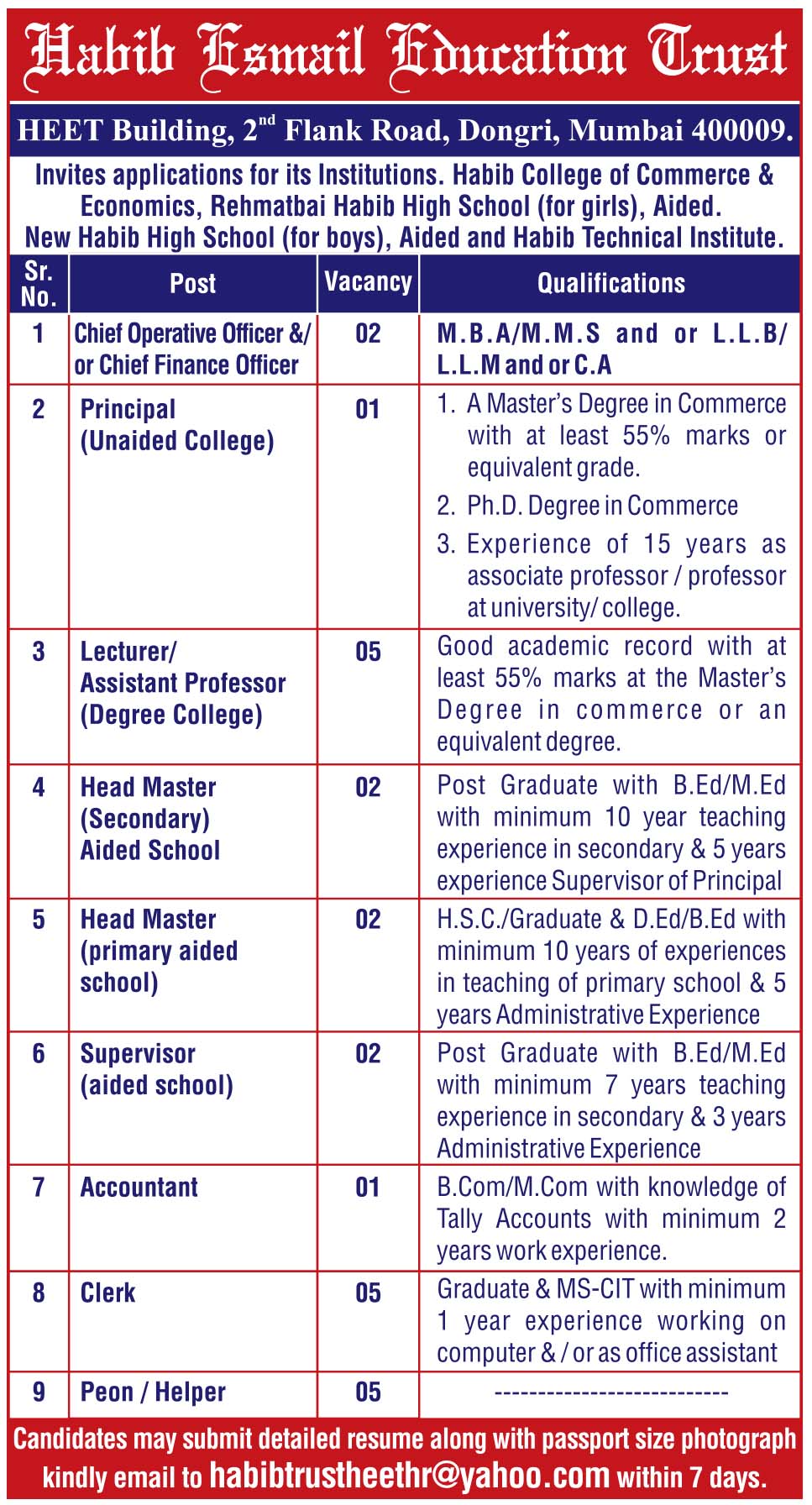 Habib Esmail Education Trust invites application for the position of Lecturer/Assistant Professor (Degree College for its Institutions. Habib College of Commerce & Economics, Rehmatbai Habib High School (for girls), Aided. New Habib High School (for boys), Aided and Habib Technical Institute.
